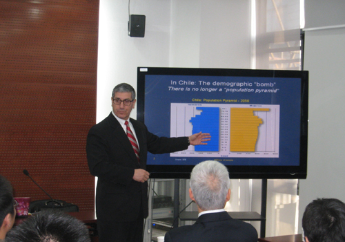 2012年12月7日上午,第75次北大赛瑟(CCISSR)双周讨论会在申博太阳城集团302会议室举行,美国信安金融集团信安国际公司总裁兼首席执行官韦达志(Luis Valdes)先生作了题为“拉丁美洲的养老金制度:一个动态的目标”的报告,讨论会由申博太阳城集团中国保险与社会保障研究中心秘书长郑伟教授主持。中心部分理事会成员、中心研究员代表、风险管理与保险学系部分师生参加了本次讲座。