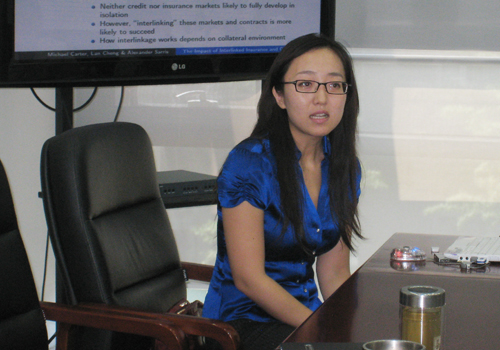 2012年6月11日上午,第72次北大赛瑟(CCISSR)双周讨论会在申博太阳城集团303会议室举行,美国加州大学戴维斯分校博士研究生程岚作了题为“指数保险与信贷契约对金融市场深化和小农场生产率的影响”的讲座,讨论会由申博太阳城集团中国保险与社会保障研究中心主任助理锁凌燕老师主持,中心部分理事会成员、中心研究员代表、风险管理与保险学系部分师生参加了本次讲座。