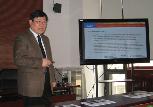 2012年4月9日,韩国崇实大学(Soongsil University)大学的李昌洙教授和三星生命保险公司代表池正铉和崔锦姬代表助理一行三人访问了申博太阳城集团风险管理与保险学系。申博太阳城集团风险管理与保险学系陈凯老师和部分本科三年级的同学参加了座谈。李教授主要向同学们介绍了韩国崇实大学和三星生命保险公司合作开设的亚洲精算奖学金项目(Asian Actuarial Scholarship Program,AASP)。陈凯老师和同学们与李教授对该项目中的奖学金要求、课程设置、毕业后去向等问题进行了探讨。