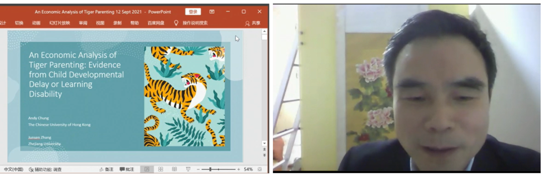 After that, Zhang Junsen, Distinguished Professor of School of Economics at Zhejiang University, gave a keynote speech entitled "An Economic Analysis of Tiger Parenting: Evidence from child developmental delay or learning disability". In his speech, he pointed out that when children have congenital developmental delays and learning disabilities, the benefits of strict tutoring of "tiger parents" will be reduced. Moreover, the improvement of parents' education level reduces the probability of severe tutoring.