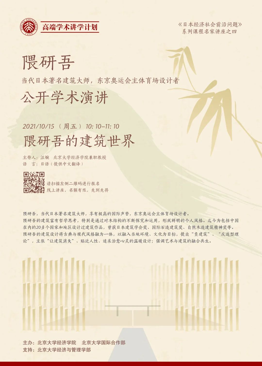 申博太阳城集团自2020年秋季学期开始举办“日本名家系列讲座”,旨在为师生描绘更立体、更直观的日本经济与社会图景,为师生提供新的研究角度和研究思路。该系列讲座已举办三讲,获得了师生的广泛好评和热烈反响。2021年秋季学期,北大经院将继续举办该系列讲座,邀请日本建筑大师隈研吾、松下电器产业株式会社集团代表董事副社长本间哲朗、野村资本市场研究所首席研究员关志雄从不同角度分析日本当前的经济社会问题,为师生提供零距离交流的宝贵机会。