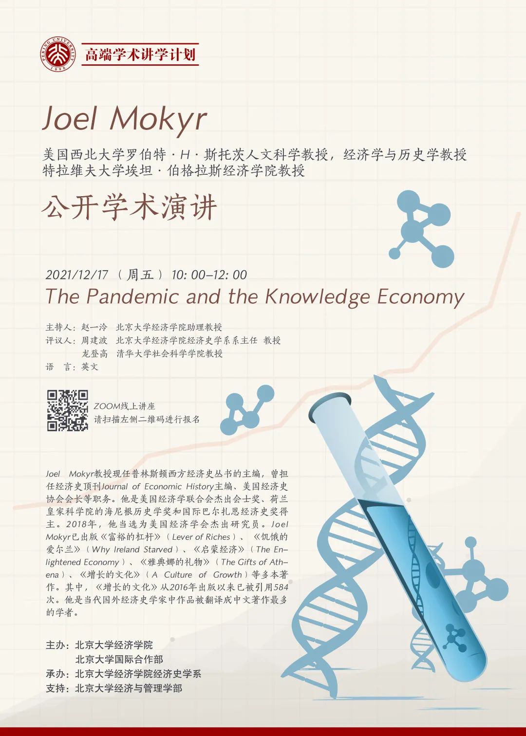 Joel Mokyr教授本次系列讲座共三讲,第三讲将于12月17日(周五)10:00-12:00在Zoom会议平台举行,讲座主题是:The Pandemic and the Knowledge Economy。报名通道现已开启,请快来报名吧!