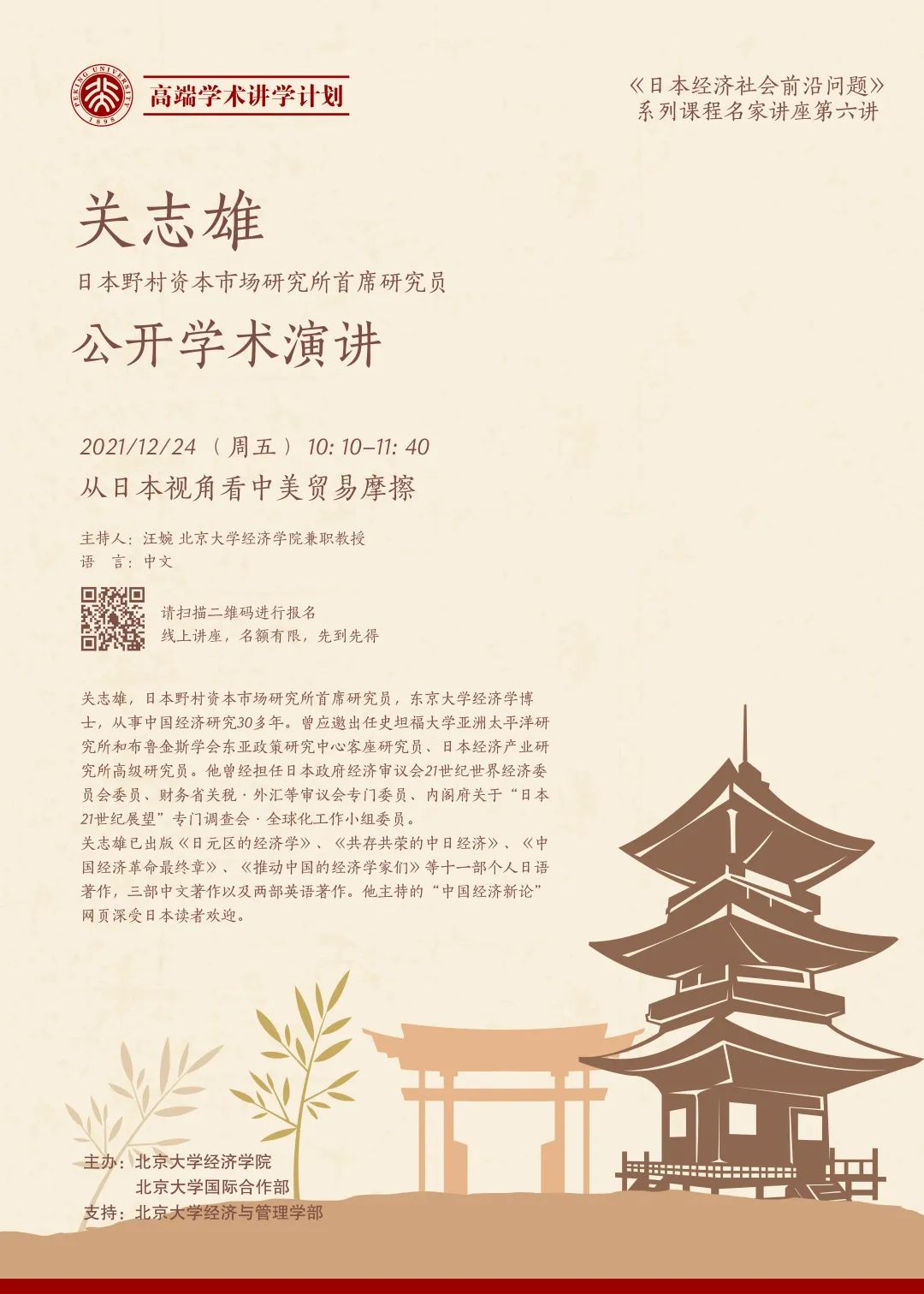 请扫描二维码或点击链接“《日本经济社会前沿问题》名家讲座第六讲报名 ”进行报名。讲座将通过线上方式进行,名额有限,先到先得。报名成功者,将于12月22日(星期三)收到确认消息及讲座地址等信息。