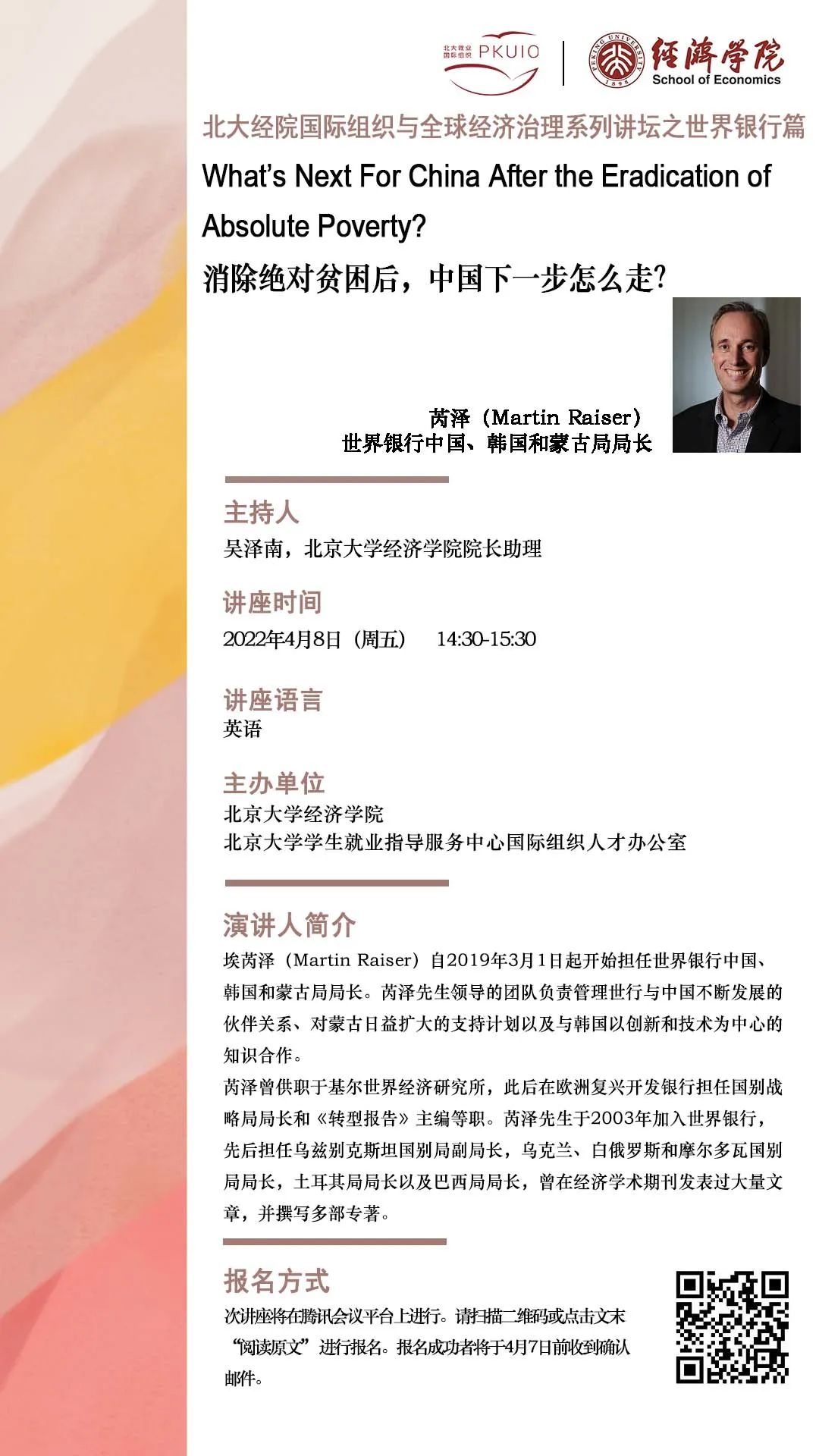 第八讲“国际组织与全球经济治理系列讲坛”将于2022年4月8日在线上举行,世界银行中国、韩国和蒙古局局长芮泽(Martin Raiser)将带来学术演讲。欢迎参与、敬请期待。
