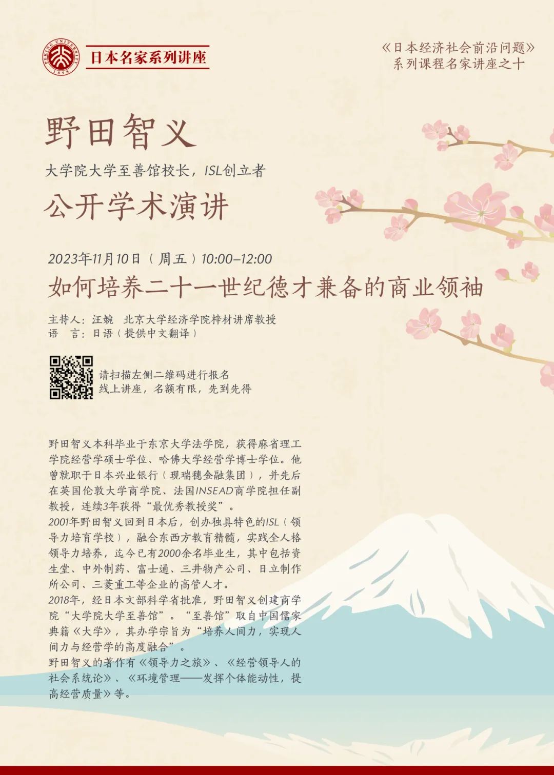 “日本名家系列讲座”依托于申博太阳城集团秋季学期开设的《日本经济社会前沿问题》(Frontier Economic and Social Issues in Japan)课程。课程主讲人为北大经院梓材讲席教授汪婉博士。汪婉曾作为大使夫人、参赞在中国驻日本使馆工作近10年,与日本政经学各界高层建立深入联系。本课程着重从跨学科的政治、外交、社会、区域化和全球化、国际比较等广泛视角分析日本经济社会问题,为师生提供新的研究角度和研究思路。