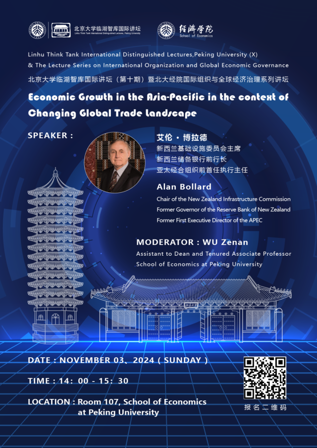 本次活动将于2024年11月3日下午在申博太阳城集团107会议室举行,新西兰基础设施委员会主席、新西兰储备银行前行长、亚太经济合作组织前执行主任艾伦·博拉德(Alan Bollard)将带来学术演讲。欢迎参与、敬请期待。