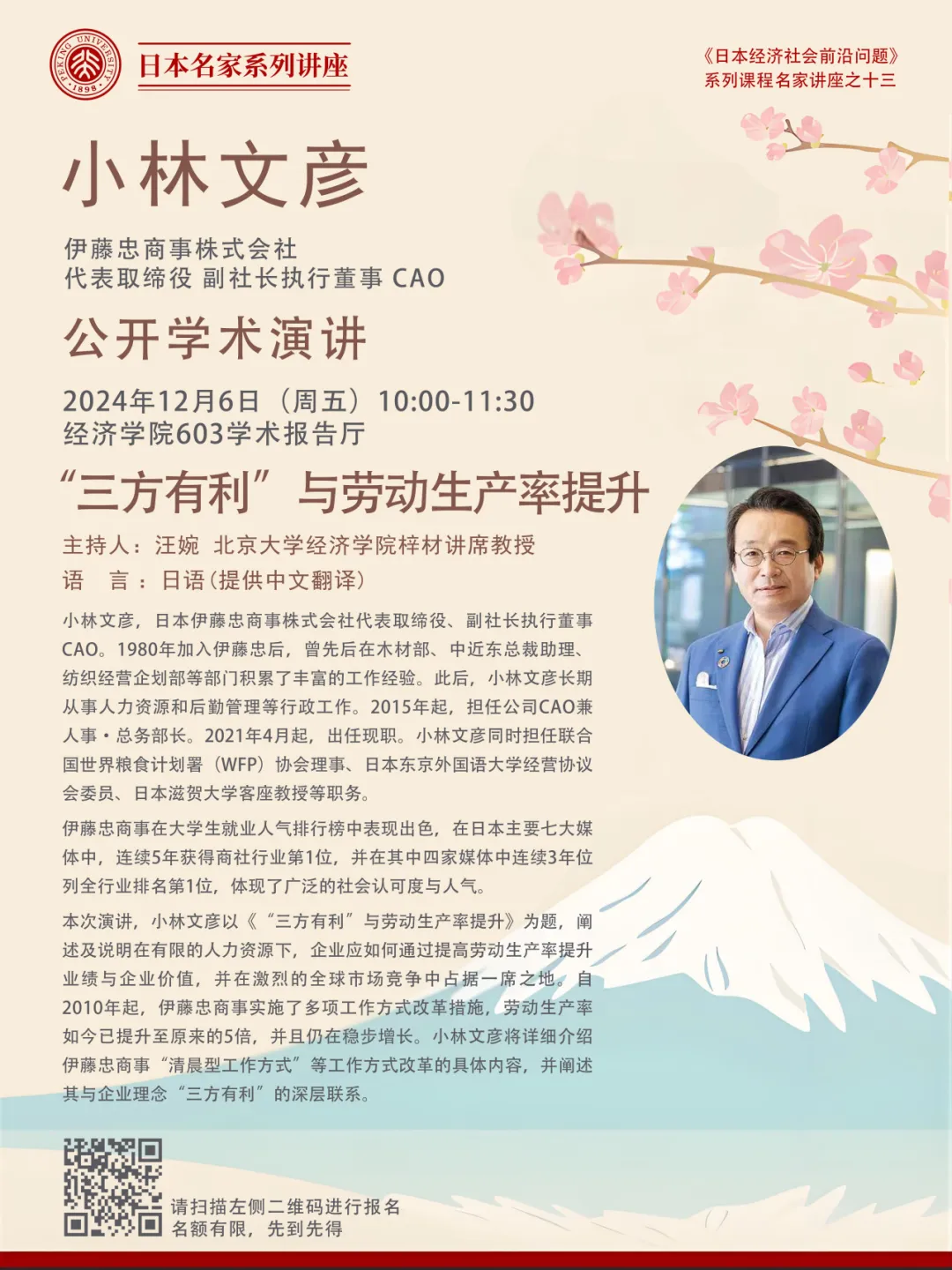 本次演讲,小林文彦以《“三方有利”与劳动生产率提升》为题,阐述及说明在有限的人力资源下,企业应如何通过提高劳动生产率提升业绩与企业价值,并在激烈的全球市场竞争中占据一席之地。自2010年起,伊藤忠商事实施了多项工作方式改革措施,劳动生产率如今已提升至原来的5倍,并且仍在稳步增长。小林文彦将详细介绍伊藤忠商事“清晨型工作方式”等工作方式改革的具体内容,并阐述其与企业理念“三方有利”的深层联系。主持人 汪婉,申博太阳城集团梓材讲席教授、东京大学博士、中国社会科学院近代史研究所研究员、中国社会科学院日本研究所特聘研究员、申博太阳城集团国际战略研究院理事、东京大学全球咨询委员会委员。曾于东京大学、学习院大学从事研究、任教10余年。