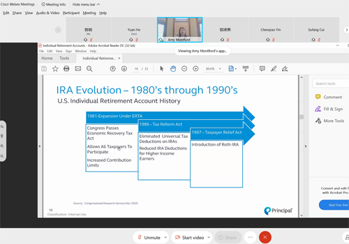 2021年3月31日,第148次北大赛瑟(CCISSR)双周讨论会以网络会议形式举行。本次讨论会的主讲嘉宾是美国信安金融集团个人退休事业部副总裁Amy Montford女士。讨论会由申博太阳城集团副院长锁凌燕主持,风险管理与保险学系系主任郑伟、陈凯老师以及风保系40余名同学参加了本次讨论会。