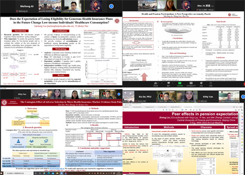 本次会议中,杜霞报告了《小额健康保险市场中逆向选择的传染效应研究:来自巴基斯坦的证据》(The contagion effect of adverse selection in micro health insurance market: Evidence from Pakistan, 合作者:郑伟、姚奕);艾美彤报告了《健康与养老保险参与:年金谜题的新视角》(Health and pension participation: A new perspective on annuity puzzle, 合作者:高明、贾若);刘佳程报告了《“脱贫脱政策”的预期是否影响低收入个体的医疗费用》(Do generous health insurance policies lead to moral hazard in low-income people? Evidence from China, 合作者:姚奕);刘子宁报告了《养老金预期中的同群效应》(Peer effects in pension expectations, 合作者:吕有吉、姚奕、郑伟)。韩笑的论文《长期护理保险对住院行为的影响:来自中国的证据》(The impact of long-term care insurance on the utilization of inpatient care: Micro evidence from China, 合作者:王瀚洋)也入选了本次会议。