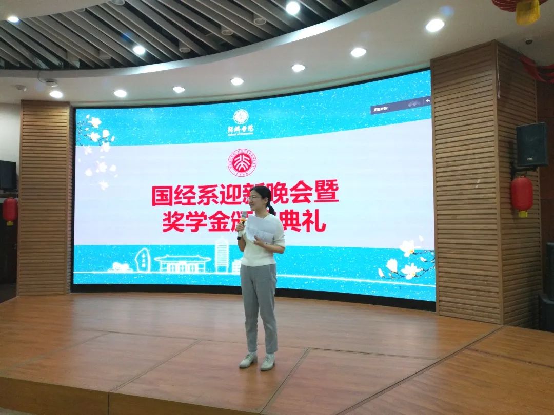 首先,国经系系主任王跃生老师致辞。他指出迎新晚会暨奖学金颁奖典礼是国经系最重要的活动之一,已举办十余年。通过这样的活动,新来的同学能够以愉快轻松的方式与各位老师、同学联谊交流,感受国经系师生其乐融融的系风,尽快融入国经系的大家庭。按照惯例本次晚会将会给品学兼优的同学颁奖以资鼓励和表彰,给同学们树立榜样,希望同学们不负韶华,争做国家栋梁。王跃生老师提到,50名本科生加入国经系大家庭是对国经系以往发展和各位老师工作的认可,同时也赋予了各位老师更大的责任——让同学们经过两年多的学习不悔当初的选择,同时为未来的发展打下良好基础。最后,他表示在疫情逐步稳定的情况下,系里将会组织更多实践活动为同学们提供深入理解理论知识的机会。
