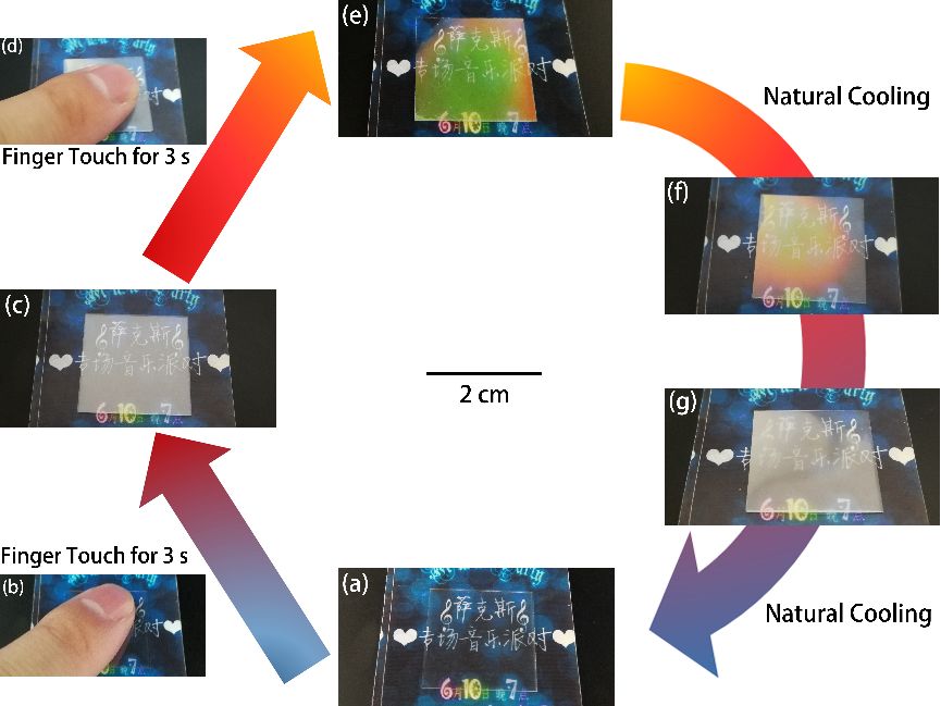 基于多种液晶材料混配制备的防伪标签可以在透明、散射、反射等多种状态之间切换,不同状态间的切换是通过调节温度实现的,并且可以通过调整组分配比将特征转变温度调整至人体体温附近,通过手指触摸实现状态切换,以满足实际使用场景的需求。而且,反射状态下,从不同角度观察,反射颜色有明显变化,属于光彩光变特性,易于人眼直接观察辨识。这些复杂的状态和颜色变化,是通过调整材料配比实现的。也就是说,该种体系达到了在不提高制造成本的前提下,大幅增加了伪造难度。通过调整材料配比制备的标签能够响应手指温度发生相转变,能够在透明、散射和反射态切换,实现了二线防伪特性,能够配合区块链可信信息记录,应用于多种防伪溯源场景。