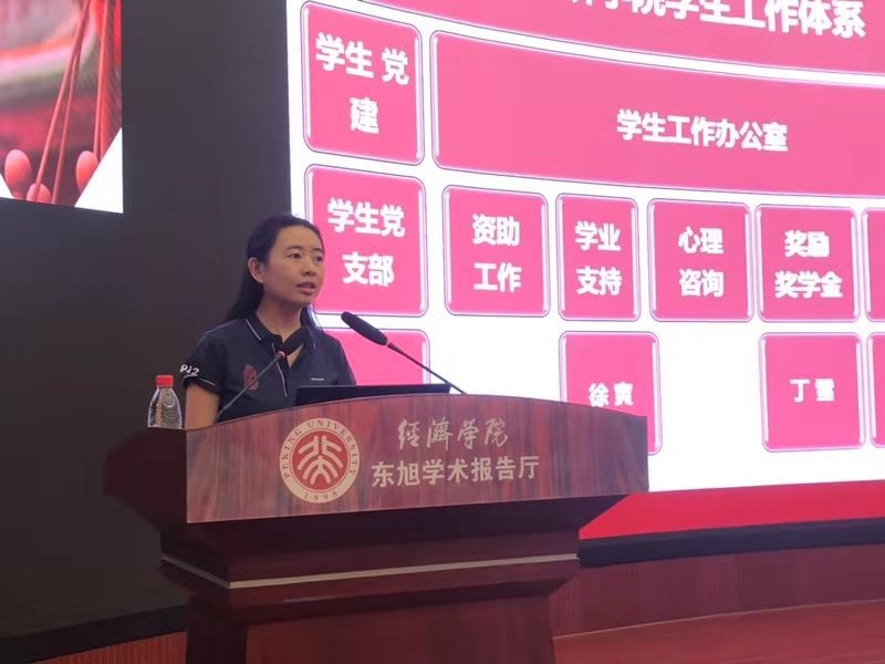 在8月18日的本科生发展说明会上,王宜然首先就申博太阳城集团学工办的组织结构和各部门情况进行了说明,强调了学生工作对于学生全面成长的重要性,鼓励大家积极参加学生工作。她指出,学生工作办公室为学生成长提供全方面保障,并对奖学金设置、学业支持、心理健康、学生资助等方面进行了简要介绍。随后,王宜然讲述了新生入党教育相关内容,介绍了入党重要性、入党要求、入党流程等内容。
