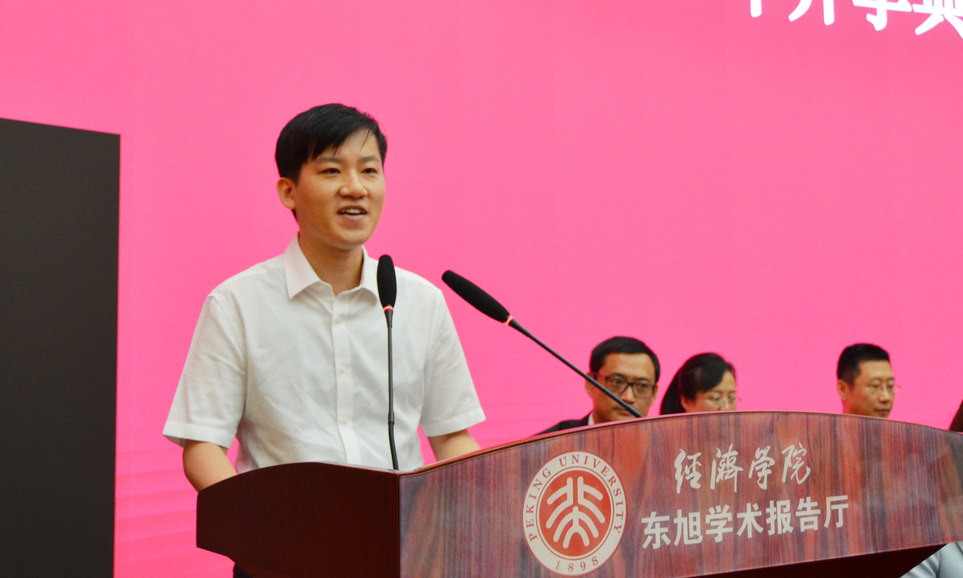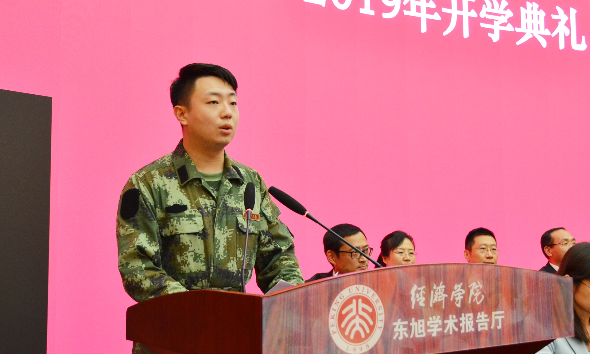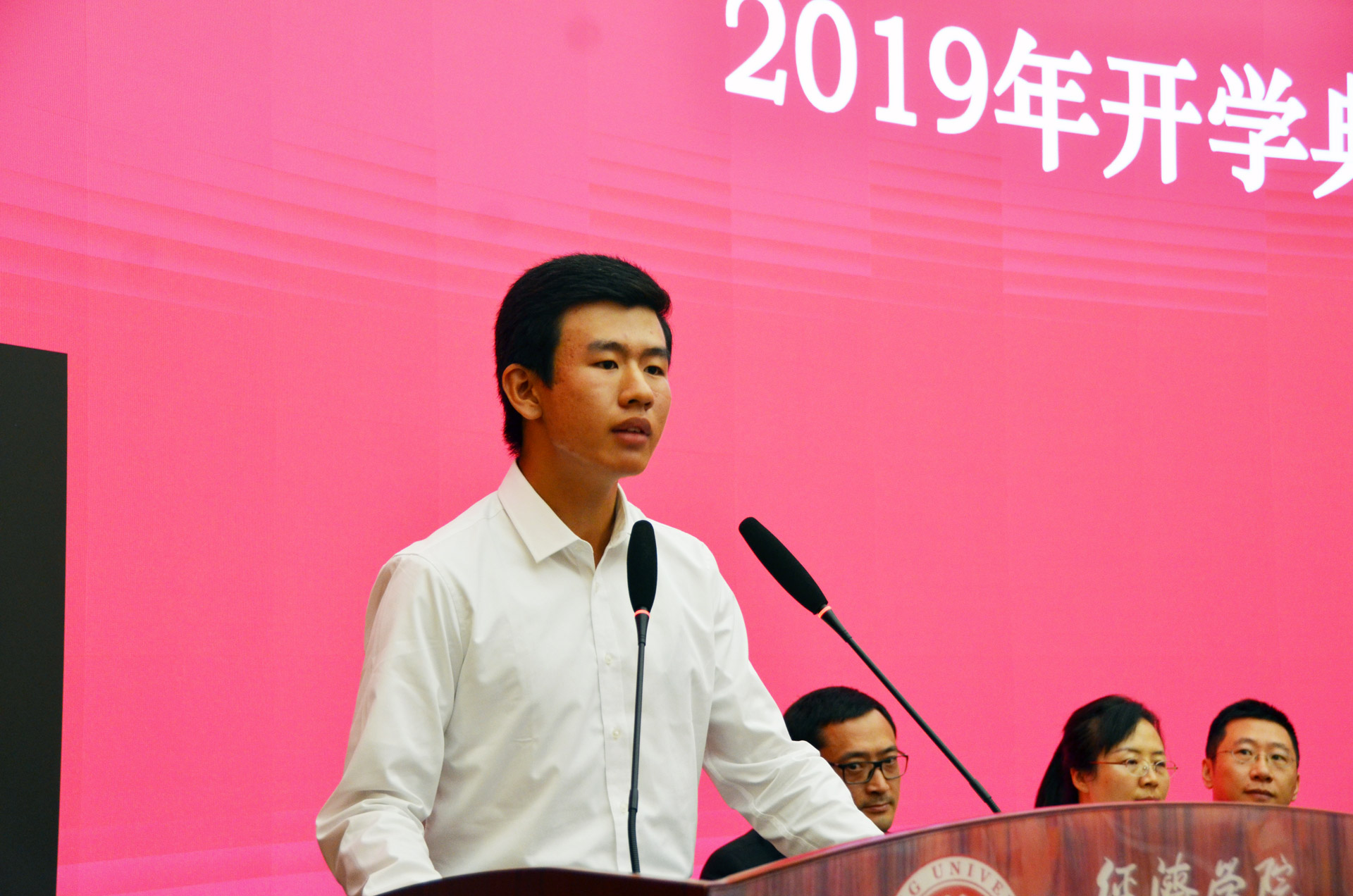本科生新生代表张圣一发言。他表示进入北大经院是人生的一个新的起点,并且在短短几天内已经感受到了学院的温暖、师长的关怀。他希望能够不负北大经院人的身份,绽放最精彩的青春。