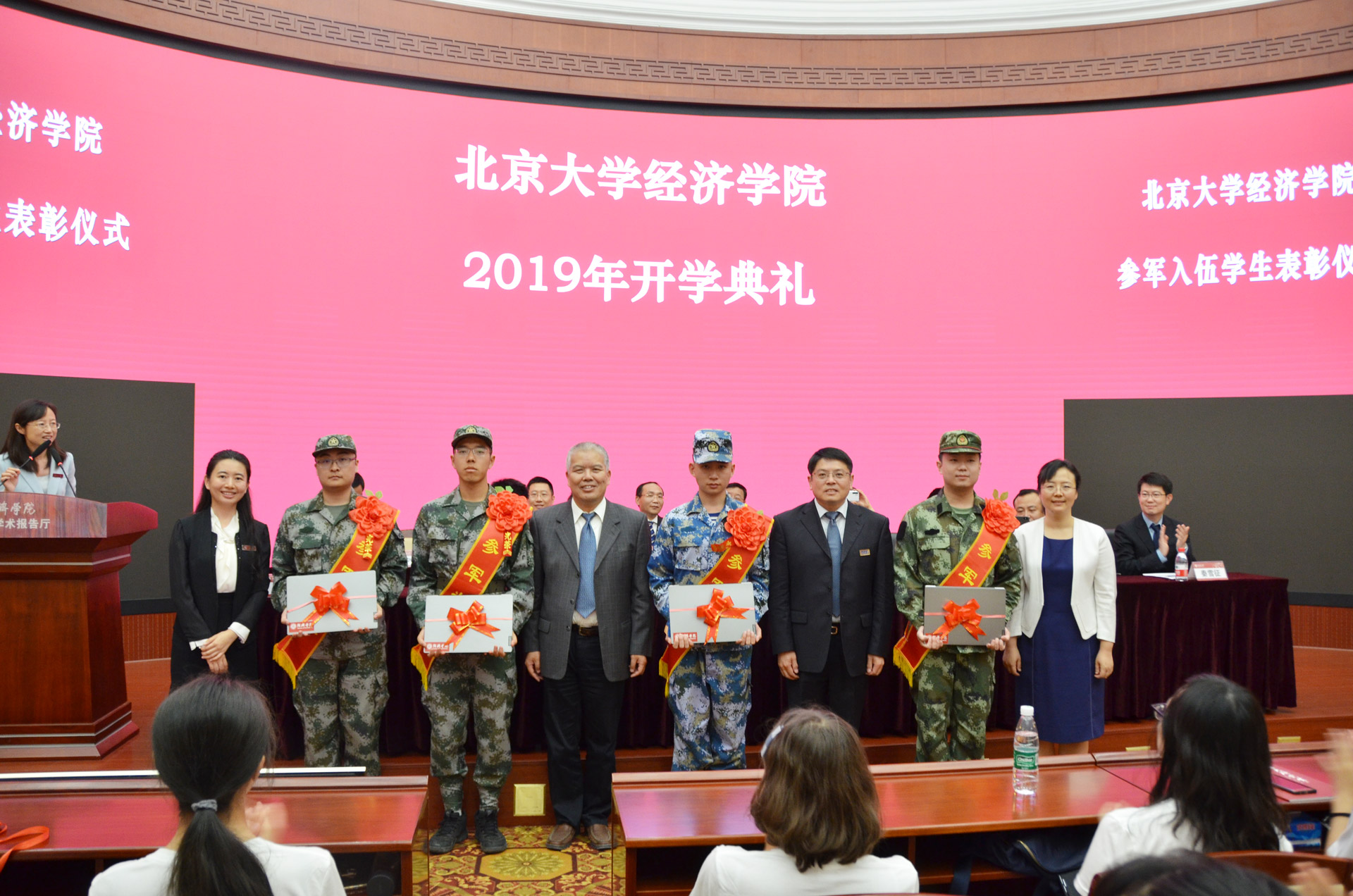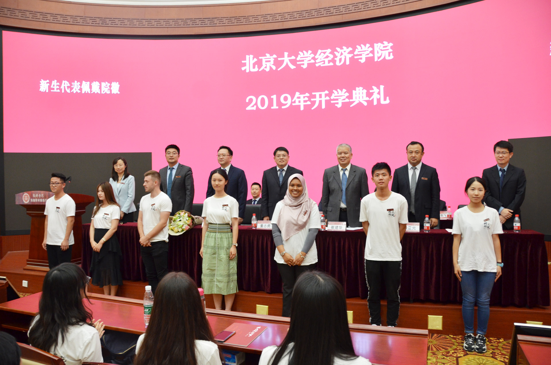 院领导和老师们为新生代表佩戴院徽姓名牌,欢迎他们成为北大经院的一员。