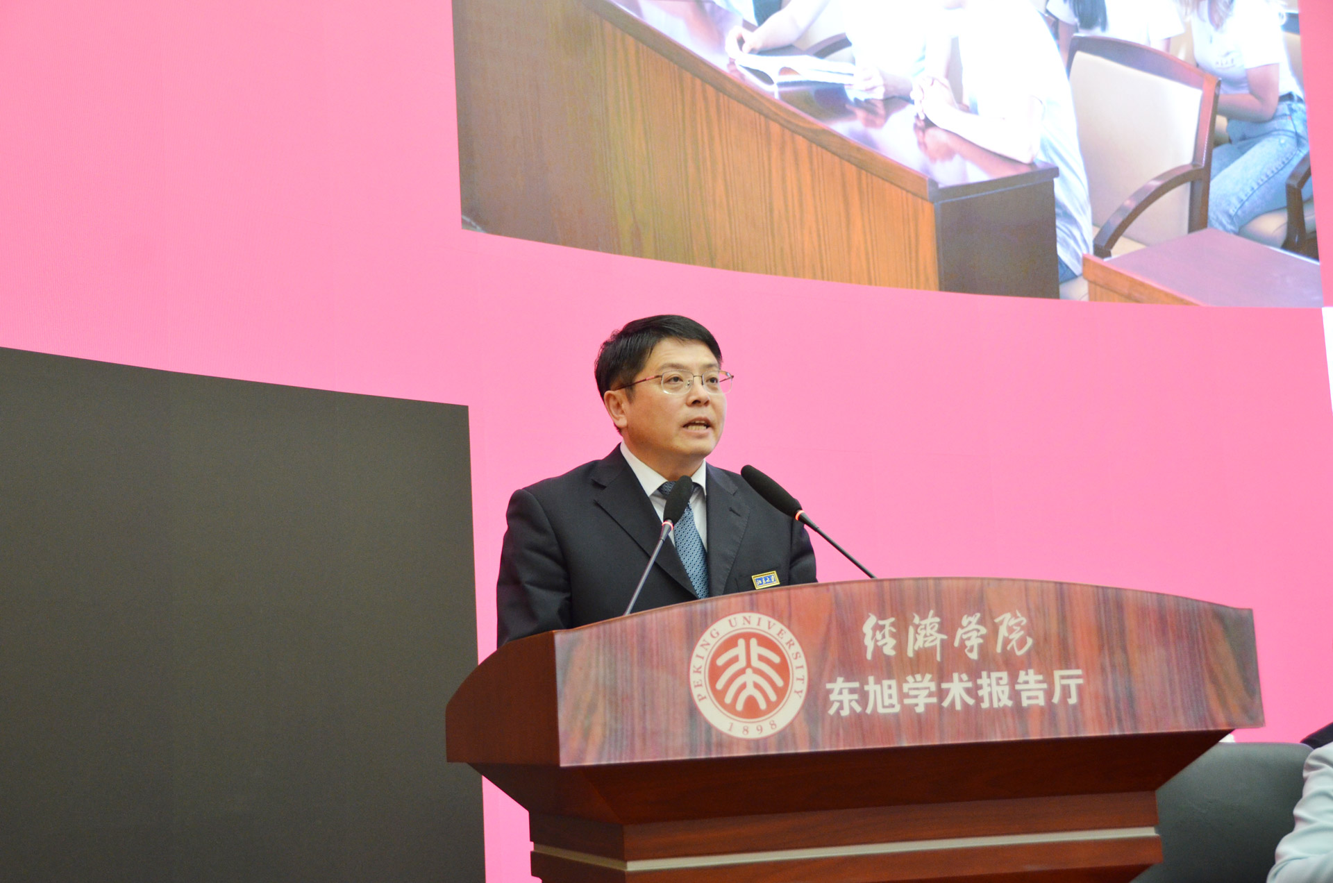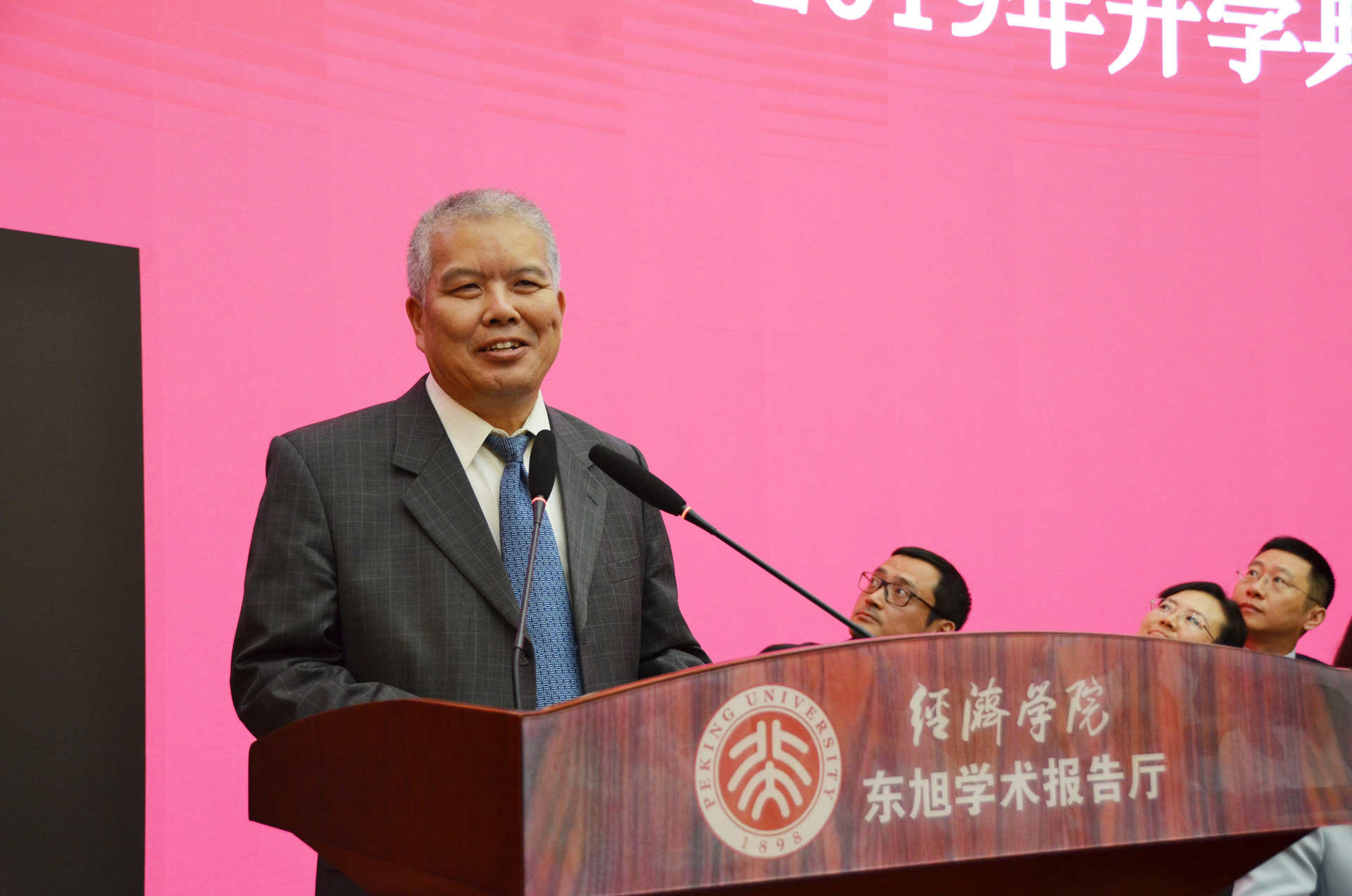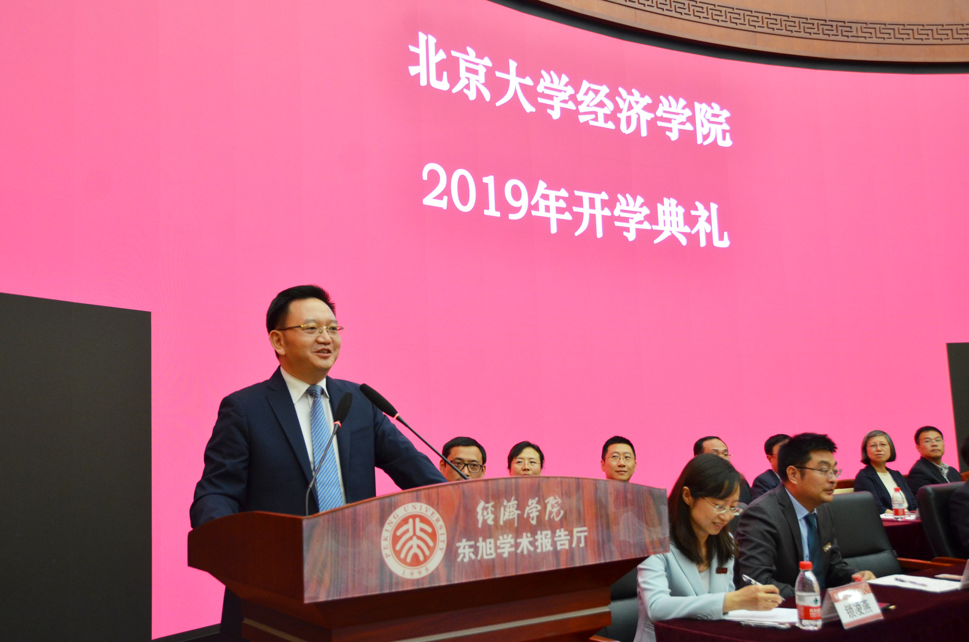 随后,董志勇代表学院致辞。他祝贺并欢迎新同学的到来,同时指出进入大学只是人生征途的一个拐点而非梦想的终点。他希望同学们在未来的征程上能够做自律、自强、自信的行者,珍惜短暂的求学时光,抱定宗旨、砥砺德行、敬爱师长,并且时时感恩,做有博大胸怀和仁爱境界的北大人。