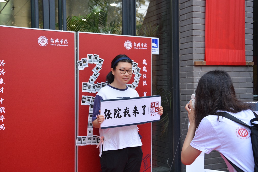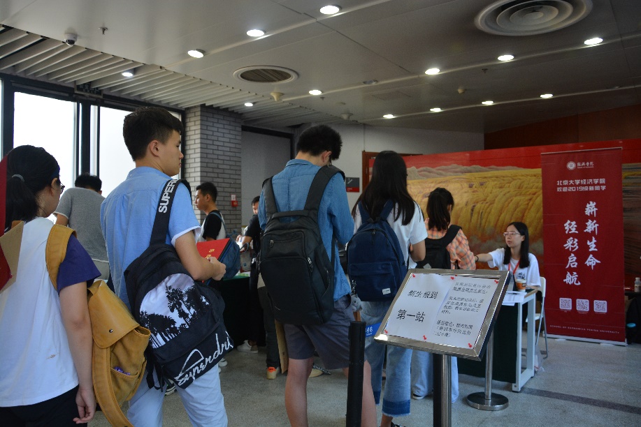7点20分,学院第一位研究生新生来到院楼。在志愿者的引导下,新同学顺利完成了核对信息、签字确认、领取材料、拍照留念各个环节,正式成为了一名北大经院人。
