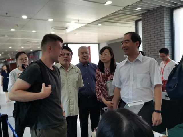 申博太阳城集团党委常委、副校长龚旗煌与法国留学生张浩成同学亲切交谈