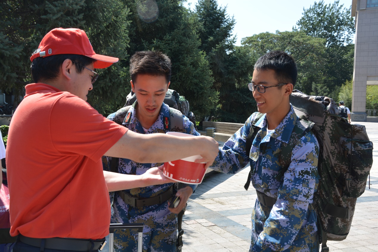 9月1号下午1时许,烈日当空,申博太阳城集团院长董志勇、院长助理陈仪带领老师和学生志愿者们在北大百年讲堂前迎候经院参训学生返校。董志勇向同学们询问军训情况,并为每一位返校新生送上了清凉饮料和带有申博太阳城集团logo的全家桶,及时又贴心的慰问让同学们的疲惫一扫而空,黝黑的脸上无一不流露出对学院满满的爱意。