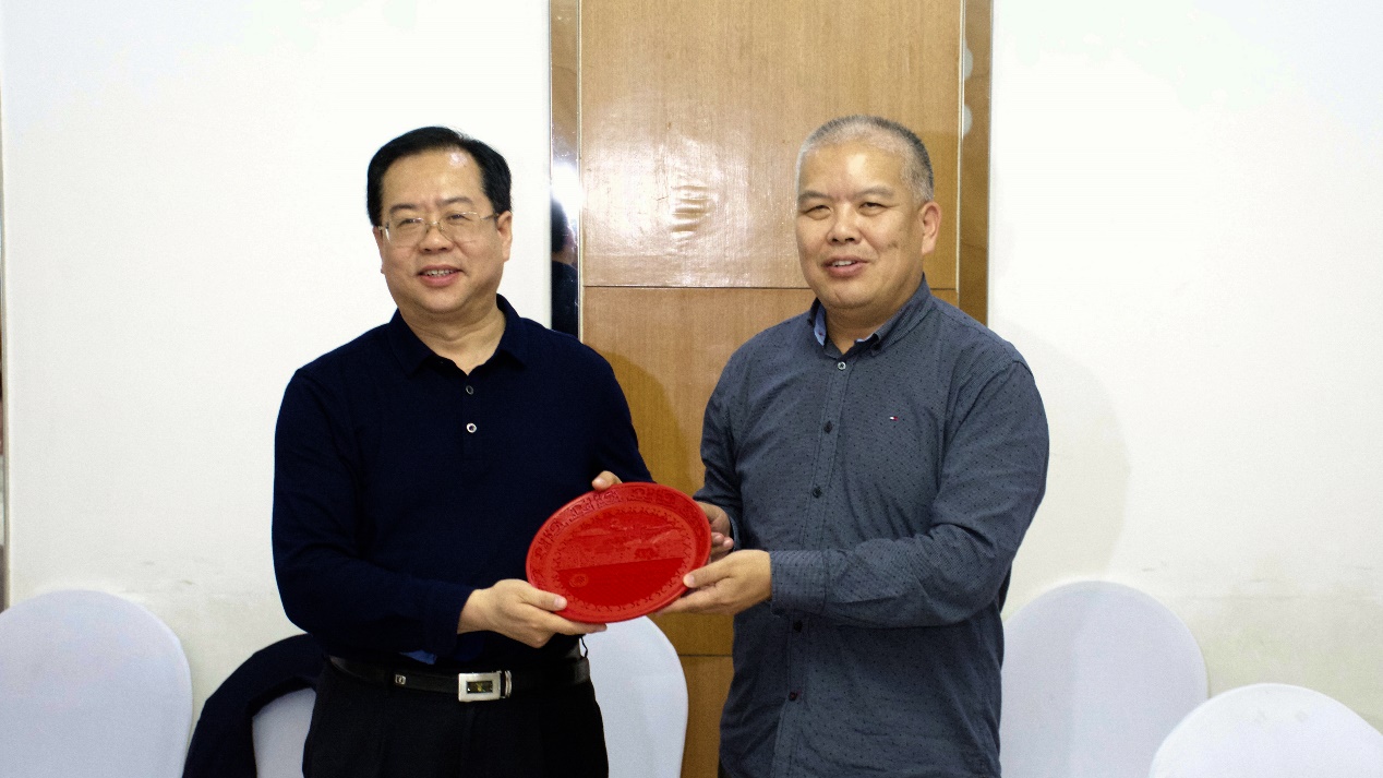 崔建华代表北大申博太阳城集团党委向延安市委组织部赠送纪念品。