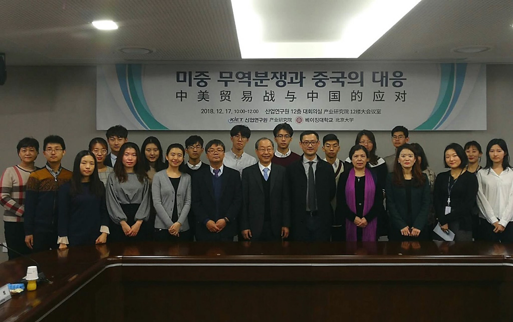 17日上午,经院代表团到访韩国产业经济与贸易研究院,受到了该院院长张志祥(Jisang Chang)、中国产业研究部部长赵㯙(Chuel Cho)等的热情接待。中韩双方共40余人出席了随后举行的学术论坛,包括北大申博太阳城集团师生、KIET师生以及韩国产业通商资源部的数位研究员。北大申博太阳城集团院长助理陈仪副教授首先就中美贸易争端发表演讲,大家围绕这一话题进行了热烈的讨论。踊跃的发言和提问,充分展现了北大经院学子的学识和风采。