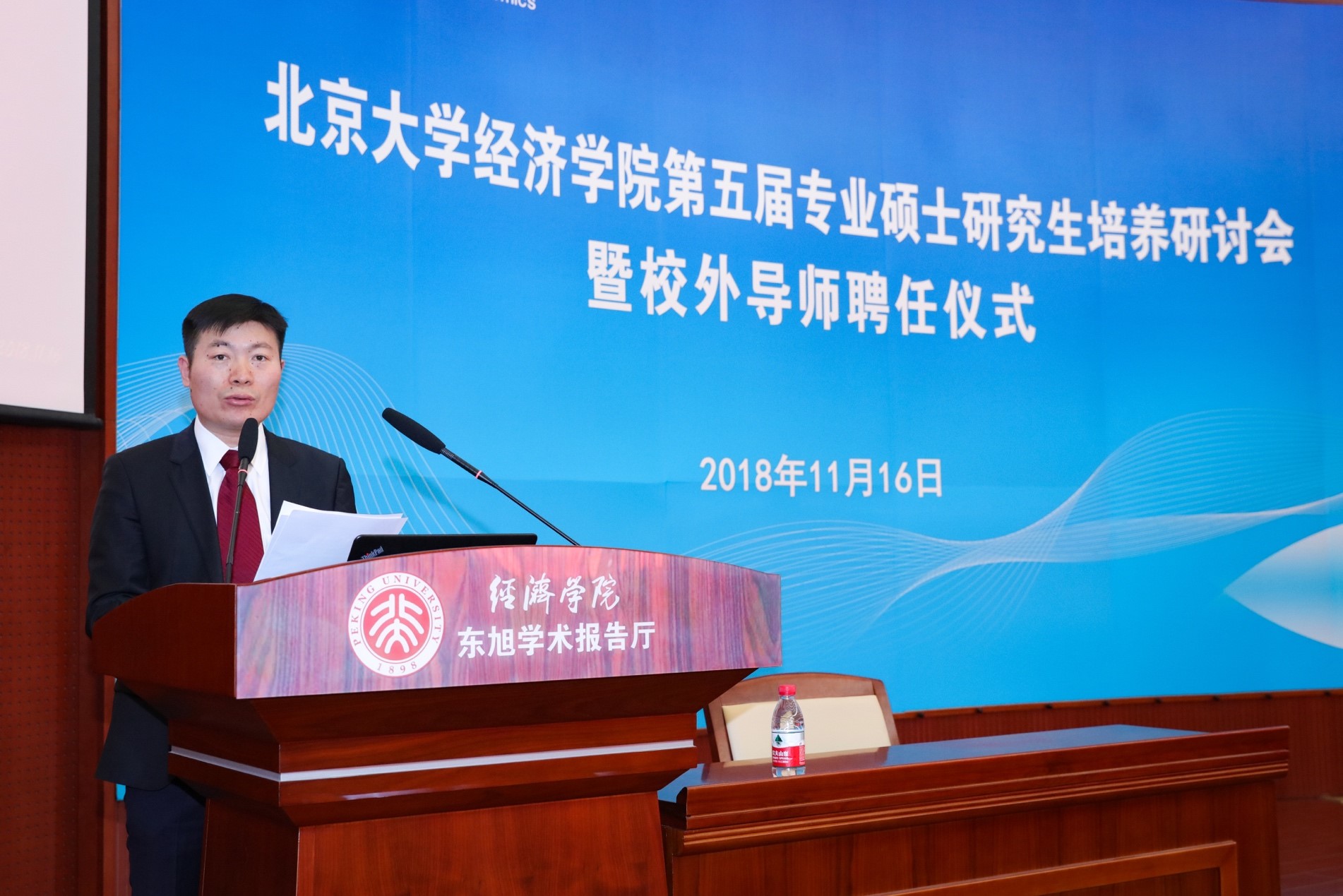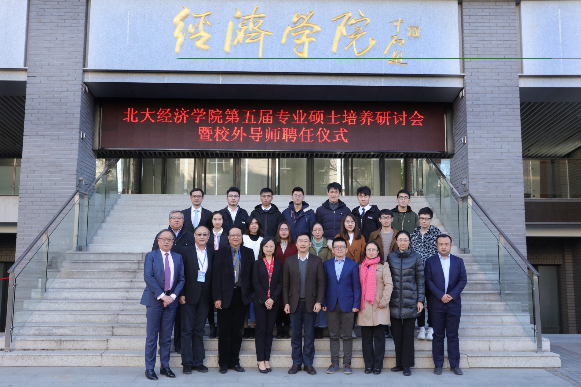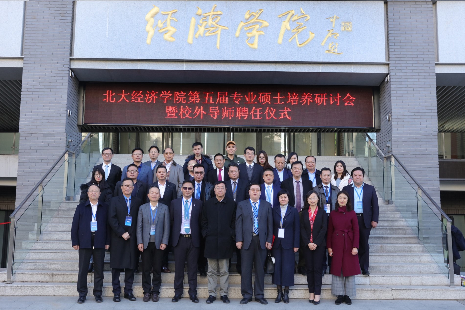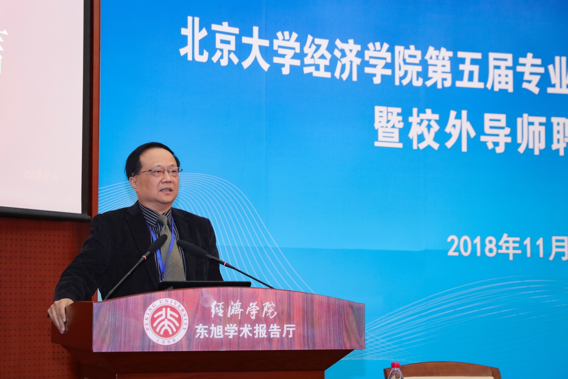 在聘任环节,董志勇和孙祁祥向优秀校外导师颁奖,锁凌燕及各系主任向新聘及续聘的专业硕士校外导师、EDP中心校外导师颁发聘书。