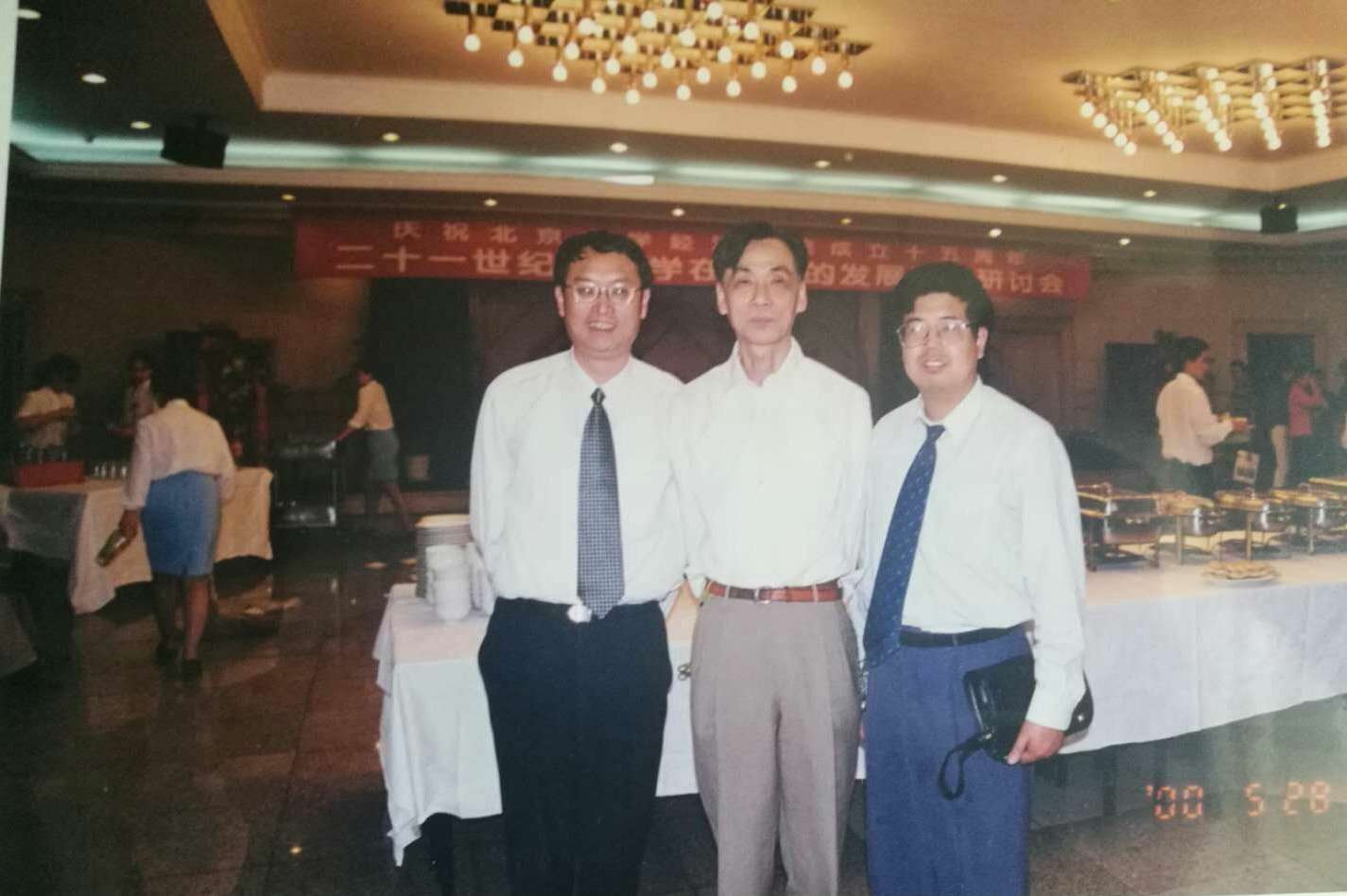 2000年,周建波教授(右一)与石世奇教授(中间)、郑学益教授(左一)在庆祝北大经济系改建为申博太阳城集团十五周年会场合影