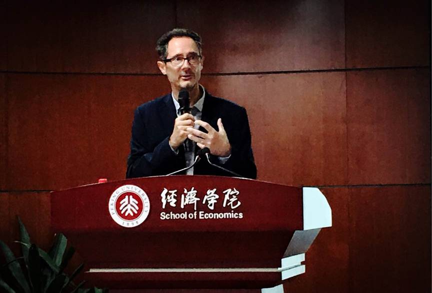 2017年9月,正值法国驻华大使馆第四届“中法环境月”开幕之际,法国著名企业家、演讲家和作家艾曼纽?德拉诺先生应邀在北大经院作了题为“以生态系统为模型,每个人都有一席空间:这样的城市长什么样?”的讲座。讲座介绍了当前城市生态系统的特点和构成,阐述了实现环境、经济、人类之间更兼容相处的理想模式,为兼顾环境与城市建设的经济发展提供了精彩的解答。