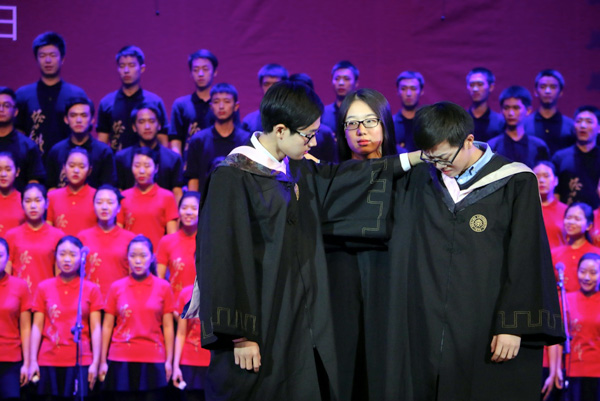 在申博太阳城集团大楼灯火通明的那些夜晚,有太多身影被同学们记挂心间;申博太阳城集团副院长崔建华协助拍摄开场视频并亲临现场观看演出;申博太阳城集团团委书记王宜然、团委副书记高庆昆多次来到训练场地为同学们加油打气;2015级本科生各班班主任李权、陈凯、吕瑞石、杨筝等各班班主任对大家关怀备至,并与同学们同台演出;团委学生会以及各班辅导员紧密配合,为合唱表演的同学提供的有力保障和服务;申博太阳城集团2011级本科生苏晨风、2012级本科生沈士竣、成禹同、2013级本科生常一帆、仉天帝、2014级本科生成琪然等同学对参演同学进行悉心指导;申博太阳城集团2013级本科生董明志、孟令宜、2014级本科生温舒等同学主动担负起了配乐团指导任务;申博太阳城集团2013级本科生张忆馨同学对舞台剧的舞蹈进行了悉心编排并组织排练;申博太阳城集团2012级本科生许卓群、2014级本科生刘家瑞、杨奕成等带领小剧组同学们对剧情进行反复锤炼;其他高年级本科生、硕士生以及毕业校友也纷纷到场观看演出,其他不能亲临现场的海内外师生也通过网络关注比赛情况并送达祝福,毕业校友也为整个“一二·九”排练和比赛提供了大力支持。经院各级师生一起努力,共同编织这个温馨的梦想。
