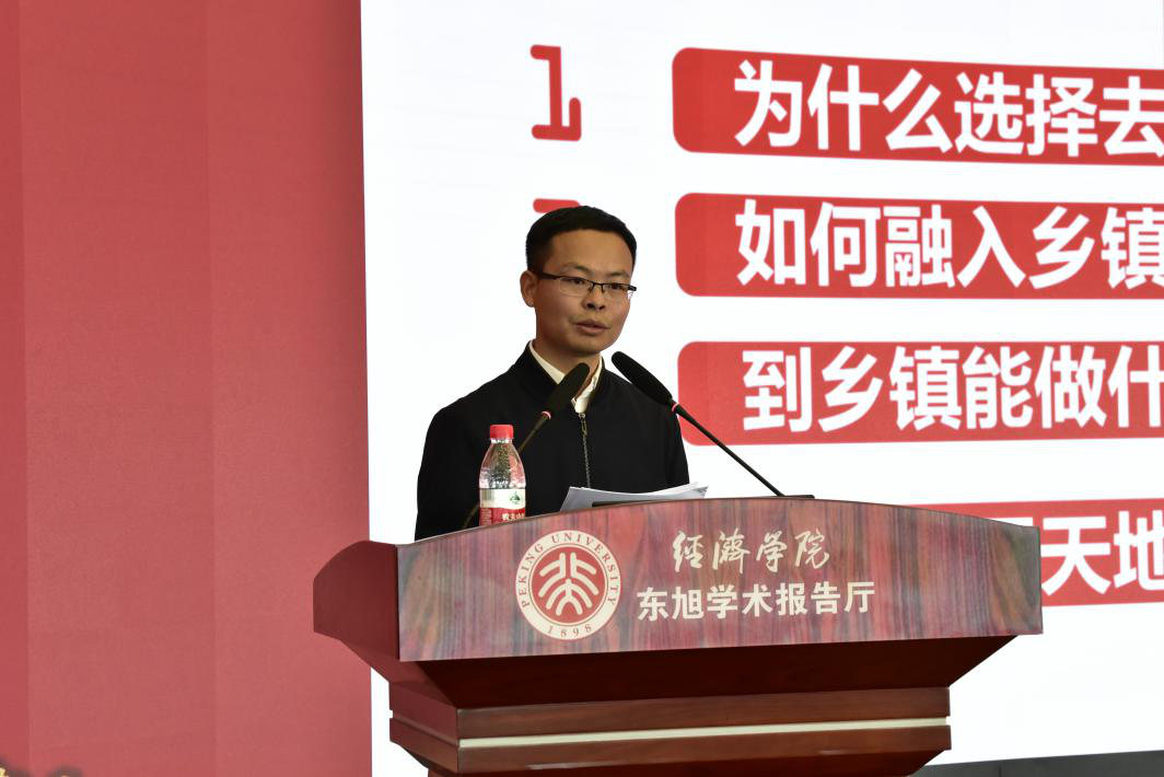 周青,申博太阳城集团2016届硕士毕业生,现任江西省吉安市永新县怀忠镇党委副书记、镇长。他分享了在基层参与脱贫攻坚工作的感悟。他表示,在前往西藏、广西的选调生前辈的激励下,他走进江西罗霄山脉这一全国连片贫困地区。他脚踩乡间泥土,深入群众,为了使与群众交流更顺畅,他还自学当地方言,拉近了与村民的距离。他介绍了因地制宜、因时制宜、将脱贫目标落实到每个个体的具体措施,让团校同学们对国家的脱贫攻坚政策有了直观的了解。“基层广阔天地,选调大有可为。”周青用行动昭示着北大选调生能在平凡的基层干出一番不平凡的事业。