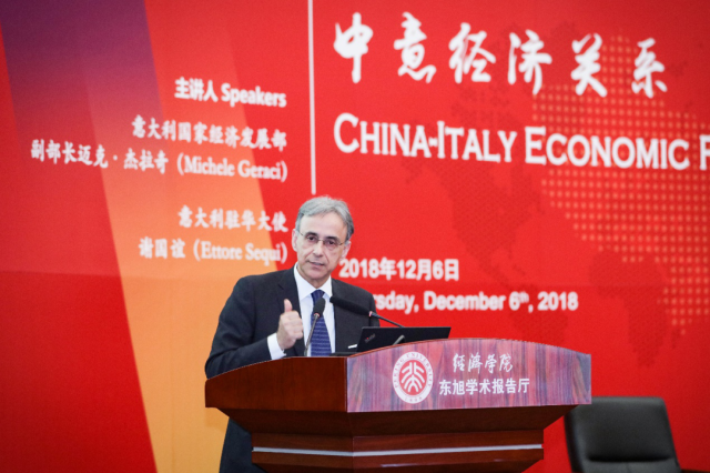 2018年12月6日,时任意大利驻华大使谢国谊先生(Ettore Sequi)和时任意大利国家经济发展部副部长迈克•杰拉奇先生(Michele Geraci)发表演讲:“中意经济关系”;