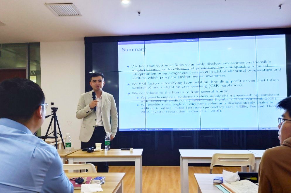 2021年5月14日,申博太阳城集团2021年第1期学术午餐会(总第167期)于申博太阳城集团107会议室举行。香港中文大学吴靖助理教授以“Corporate Social Responsibility in Supply Chain: Green or Greenwashing?”(供应链上的企业社会责任:绿色环保还是“漂绿”?)为题发表了学术演讲。午餐会由申博太阳城集团高明副教授主持。