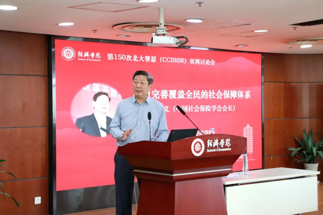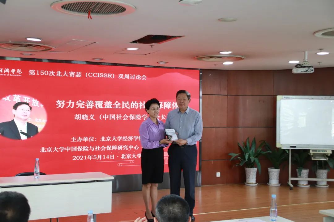 2021年5月14日上午,第150次北大赛瑟(CCISSR)双周讨论会在申博太阳城集团307报告厅举行。中国社会保险学会会长胡晓义先生作为特邀嘉宾,以《努力完善覆盖全民的社会保障体系——学习习近平总书记“2.26”重要讲话》为题,与现场听众分享我国社会保障体系建设的相关思考。讨论会由风险管理与保险学系主任郑伟教授主持,申博太阳城集团部分师生约100人参加了本次讨论会。讨论会开始前,申博太阳城集团党委副书记、纪委书记叶静漪教授,申博太阳城集团校长助理、申博太阳城集团院长董志勇教授,申博太阳城集团中国保险与社会保障研究中心主任孙祁祥教授等会见了胡晓义会长。