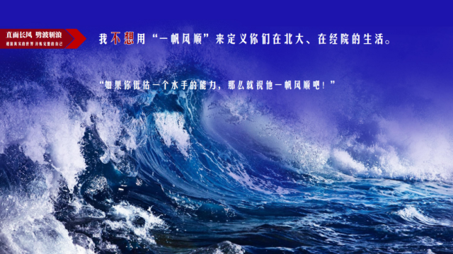 一方面,我不想用“一帆风顺”来定义你们在北大、在经院的生活。因为这样的顺利,往往以更大的损失作为交换条件。它可能是放弃卓越,“今朝有酒今朝醉”;可能是拒绝创新,“一成而不可变”;可能是逃避问题,“躲进小楼成一统”;甚至,可能是违背底线,是漠视规则,忘却初心。哲学家尼采说:“如果你低估一个水手的能力,那么就祝他一帆风顺吧!”所以,在这重要的开学第一课上,面对着在同龄人中最出色的你们,我当然不希望用“一帆风顺”来框定你们无限的可能性边界,扼杀你们征服世界、征服未来的壮志豪情。