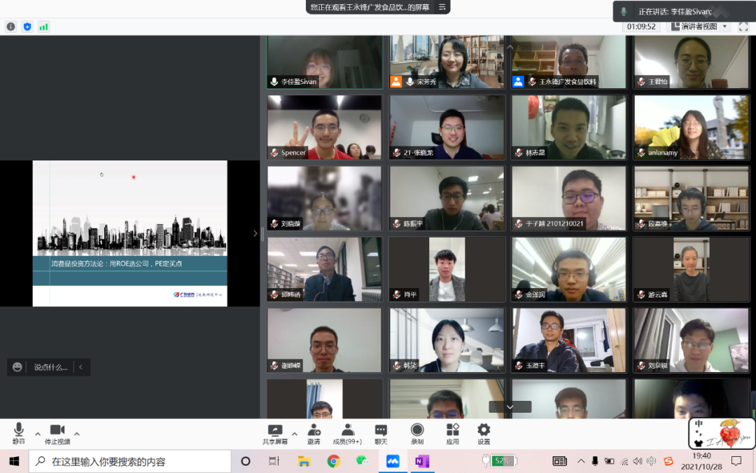 2021年10月28日晚,“行业研究前沿”课程在腾讯会议线上举行。广发证券食品饮料行业首席分析师王永锋先生作为第三讲主讲人,以《消费品投资方法论》为题与师生进行了深入交流。本次讲座由申博太阳城集团金融系宋芳秀老师主持,来自申博太阳城集团及学校其他院系的一百余名本科生和研究生同学参加。