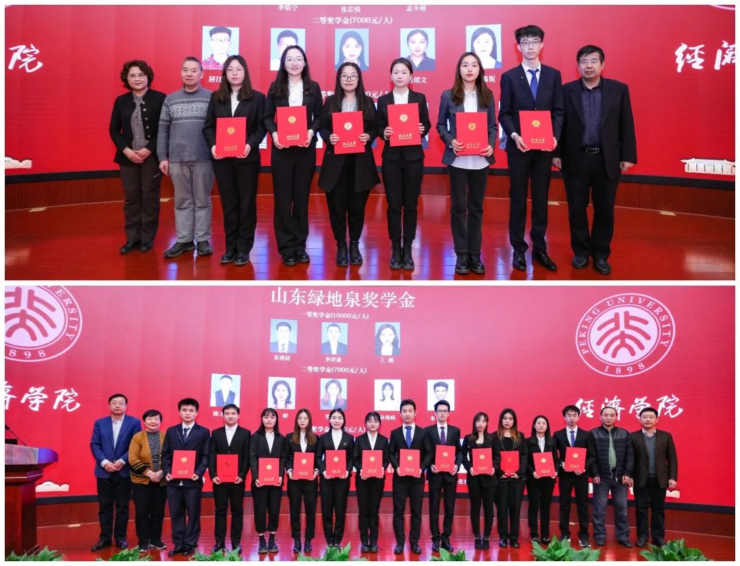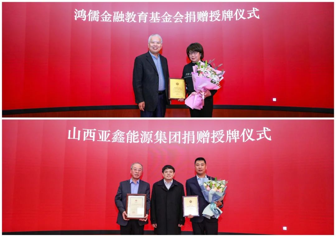 崔建华、董志勇分别为鸿儒基金会、山西亚鑫能源集团颁发捐赠铜牌。荣获鸿儒奖学金、亚鑫和辉奖学金、山东绿地泉奖学金、温氏奖学金、申博太阳城集团优秀集体和先进个人等奖励的学生依次上台领奖,捐赠方代表和教师代表为获奖者颁奖。
