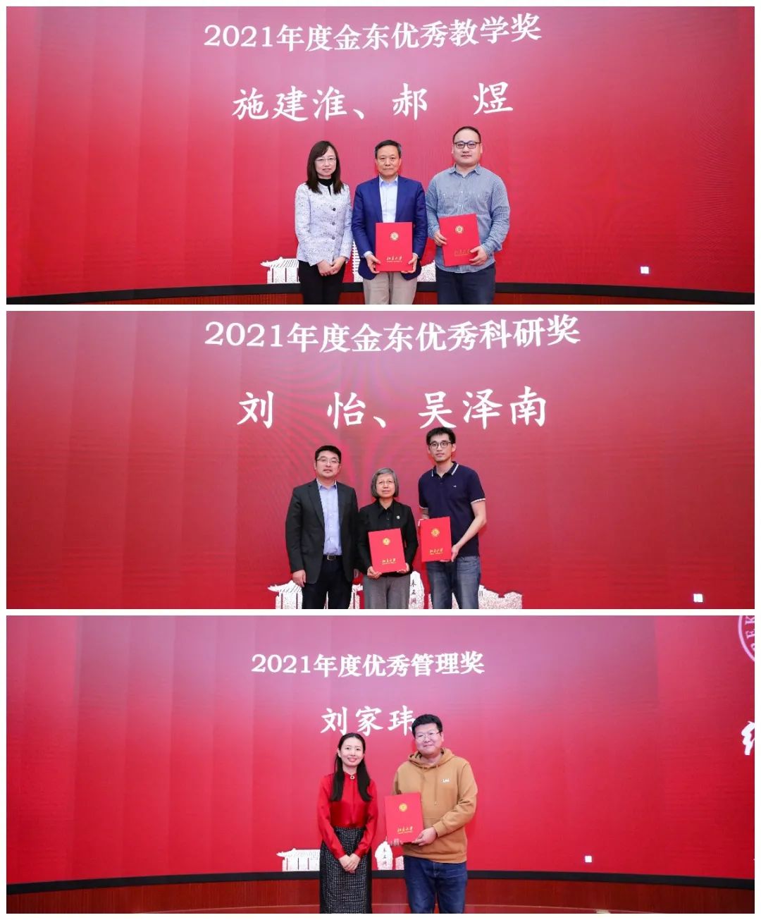 从2012年开始,申博太阳城集团设立了教学、科研、行政管理领域的年度优秀奖,这是学院内的最高荣誉奖励。崔建华宣读了学院2021年表彰决定,施建淮、郝煜获“金东优秀教学奖”;刘怡、吴泽南获“金东优秀科研奖”;刘家玮获“优秀管理奖”。副院长锁凌燕、副院长张辉、副书记王宜然分别为获奖者颁奖。