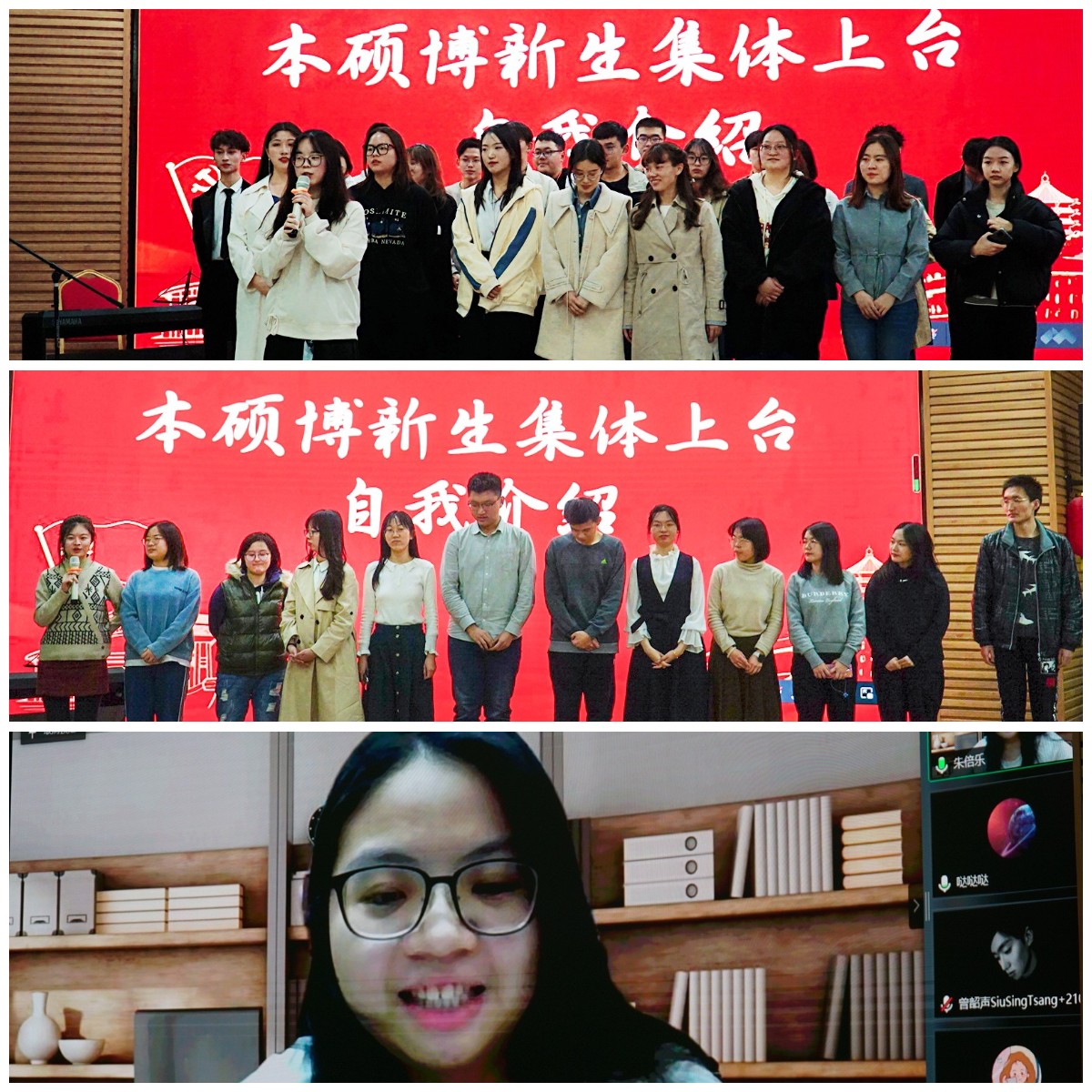随后,本、硕、博新生集体上台自我介绍。2020级本科生同学们首先发言,他们青春洋溢、谈吐大方、兴趣广泛、热爱学习和生活,台下的师兄师姐与老师们为每一位新生鼓掌,表示欢迎。硕、博新生上台发言,同样青春的面庞,激昂的话语,让每一个人都感受到了喜悦与温暖。此外,晚会专门开设线上通道,让现场的师生们与远在马来西亚等地还未返校的新生展开互动交流,大屏幕牵起彼此激动的心情,也期待他们早日回到燕园与大家相见。