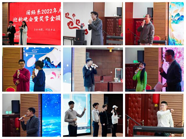 师生联谊迎新会由2020级本科生许兆麟和余懿主持,2020级迎新会工作组呈现了一场精彩绝伦的文艺表演。2020级本科生雷家骏演唱的《第三人称》,让在场的师生沉浸在浪漫而温柔的气氛里;吴群锋老师带来歌曲《红日》,歌声振奋人心,他也在表演中为在场师生表达祝福;2019级本科生张纪泽与赵芃漪带来的相声《歪批三国》,金句频出,将经济学知识与三国故事的巧妙结合,令师生忍俊不禁;2020级本科生卢宇波带来歌曲《灯塔》,动情的歌唱仿佛点亮了众人心中的灯塔;戚自科老师与陈仪老师合唱歌曲《相逢是首歌》,旋律经典,合唱默契;2020级博士生黑烨带来歌曲《听海》,配合着身后的彩幕大海,带来深情共鸣,仿佛把师生们带入了涛声阵阵的海边。