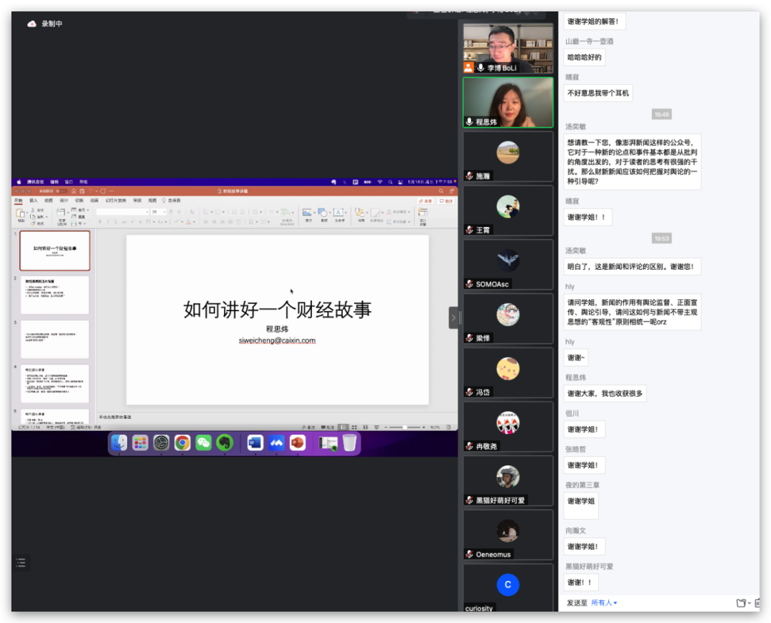 随后,程思炜以自己调查直播行业的经历为例,向同学们分享如何了在实战中发现和把握主要矛盾。她提醒大家要敏锐把握自己对于某个新闻所产生的第一反应,它大概率也是多数人的关注和兴趣所在,可以深入挖掘。如果问题涉及自己相对陌生的领域,则需要大量资料搜集或者追踪那些长期关注该领域的专业人士和机构的观点,来增加自己对问题的了解。
