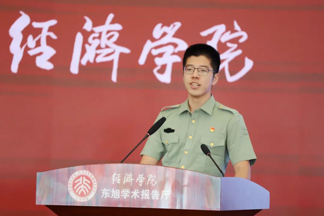 2017级本科生董晨晖作为在校生代表发言。他曾服役于北部战区陆军边防某部,获评“四有”优秀士兵,退伍返校继续完成学业,并担任2022级本科新生辅导员。董晨晖以“在奋斗中砥砺青春”为题,结合参军入伍和实践经历分享了自己的收获。他表示,砥砺奋进方能不负韶华、只争朝夕方能无悔青春、胸怀家国方能实现价值,并勉励同学们作为北大经院的一员,应时刻牢记时代责任,在社会主义现代化建设的伟大洪流中实现个人价值。