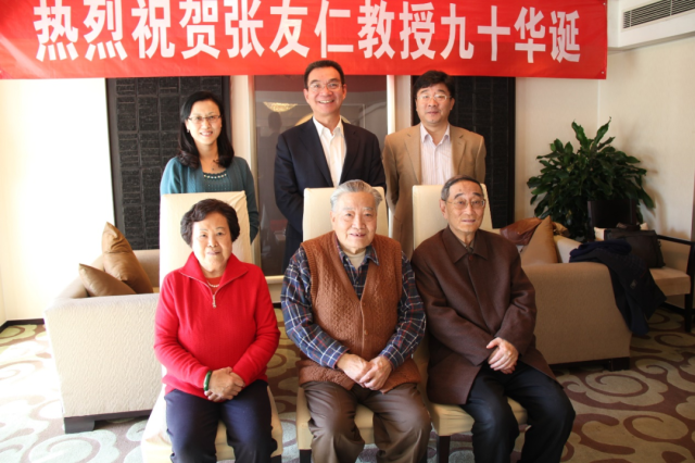 张友仁先生90寿辰时,学院为张先生举办了一场简朴但隆重的生日宴会。校方对此非常重视。朱善璐书记因为参加“十八大”不能亲自前来,专门写来贺信,当时还是北大副校长的刘伟教授代表学校前来祝贺,厉以宁老师、张友仁老师的学生林毅夫教授等都来参加了生日聚会。厉老师跟我们回忆了当年他跟张老师交往的许多往事,高度赞扬了张老师的人品。两位德高望重、耄耋之年师生之间的深厚情谊让人羡慕、感动不已。