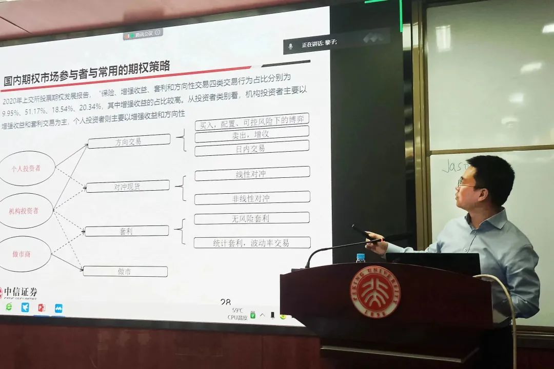 讲座开始前,北大金融工程实验室黎新平老师介绍了本次讲座的主题并热情欢迎了主讲嘉宾蔡成苗先生。蔡成苗先生首先介绍了自己在做市业务和期权交易领域的从业经历,并从做市品种及市场规模、做市业务介绍及期权交易策略三个方面进行了深入的分析。