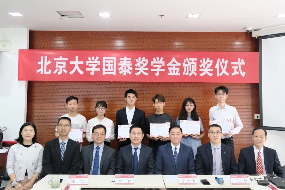 随后,陆家嘴国泰人寿北京分公司总经理丁业超宣读了获奖证书,国泰人寿北京代表处首席代表王政传先生作为颁奖嘉宾为获奖同学们颁奖。获得本年度国泰奖学金的同学包括本科生王奕然、毛董琴、曹璇、吴子强,硕士生梁雅诗和博士生谢志伟。颁奖仪式结束后,全体获奖同学与参会嘉宾、老师合影留念。