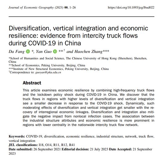 近日,申博太阳城集团郭研副教授与申博太阳城集团申博太阳城集团新结构经济学研究院张皓辰博士、香港中文大学(深圳)人文社科学院讲师方达的合作论文“Diversification, Vertical Integration and Economic Resilience: Evidence from Intercity Truck Flows during COVID-19 in China”被经济地理和区域经济学顶级期刊Journal of Economic Geography正式接受发表。