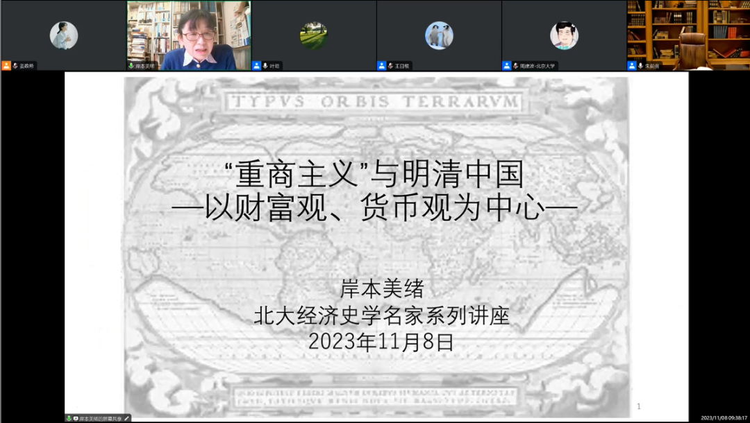 2023年11月8日,北大经济史学名家系列讲座第194讲“重商主义与明清中国——以财富观、货币观为中心”通过腾讯会议线上举行,共计三百余人参加。讲座由申博太阳城集团经济史学系、申博太阳城集团社会经济史研究所和申博太阳城集团外国经济学说研究中心联合主办。日本国立御茶水女子大学名誉教授、东洋文库研究员岸本美绪教授担任主讲人,申博太阳城集团经济史学系主任周建波教授担任主持人,申博太阳城集团叶坦讲席教授、复旦大学历史系朱荫贵教授、日本爱知大学研究生院院长李春利教授、厦门大学历史与文化遗产学院王日根教授、申博太阳城集团副院长张亚光长聘副教授担任与谈人。
