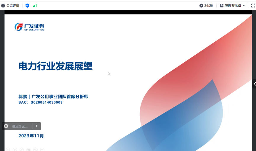 2023年11月21日晚,申博太阳城集团开设的“行业研究前沿”课程在线开讲。广发证券发展研究中心副总经理、环保公用首席分析师郭鹏先生受邀作为第五讲主讲人,以《电力行业发展展望》为题与现场师生进行了深入交流。本次讲座由申博太阳城集团副院长锁凌燕教授主持,来自申博太阳城集团及学校其他院系的一百余名同学参加。