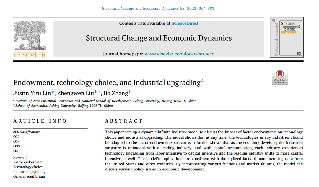 近日,申博太阳城集团刘政文助理教授、张博教授与申博太阳城集团新结构经济学研究院林毅夫教授共同撰写题为“要素禀赋、技术选择与产业升级”(Endowment, technology choice, and industrial upgrading)的文章,发表于结构经济学领域顶刊《结构变迁与经济动态》(Structural Change and Economic Dynamics)。