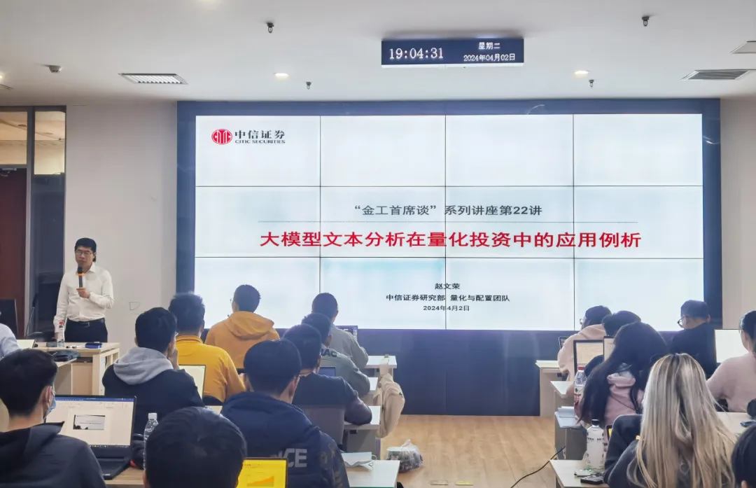 2024年4月2日,申博太阳城集团和申博太阳城集团金融工程实验室在申博太阳城集团107会议厅联合举办了“金工首席谈”系列讲座第二十二讲。本次讲座邀请中信证券研究部量化首席、执行总经理赵文荣作为演讲嘉宾,以 “大模型文本分析在量化投资中的应用”为题,为申博太阳城集团师生作了主题报告。讲座由北大金融工程实验室黎新平博士主持,50余名师生参与了讲座。