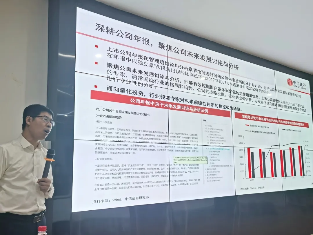 在算法决策洞览基本面方面,赵文荣强调了政策和报告数据化的重要性,以及如何利用大数据分析舆情热度等指标。此外,他还分享了对年报的批量解构方法。