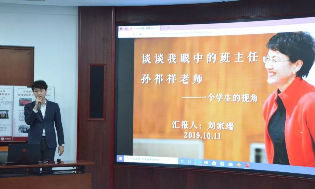 由于孙祁祥老师在外开会,无法参加本次班主任工作研讨会,特委托班长刘家瑞对班级工作进行总结。刘家瑞从一个学生的视角,从集体活动、课堂学习、言传身教等角度介绍了自己感受到的班主任工作。他介绍了以“我们与这个世界”为主题的班会以及班主任对学生的“全人教育”,认为学生在关注学业之外,还要怀有心怀天下的胸襟和气魄。他引用了班主任“优秀是一种习惯”、“仰望星空但更要脚踏实地”等寄语,表达了对班主任工作的感谢。